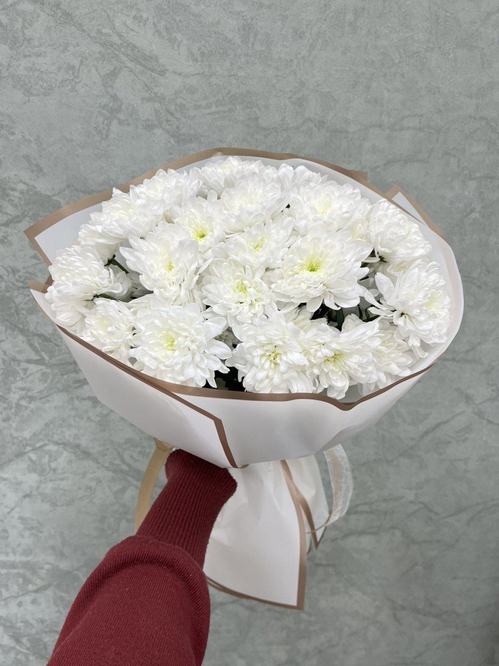 5 белых хризантем в нежном оформлении
