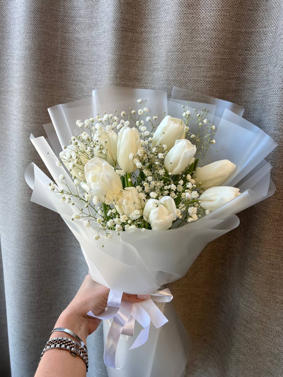 Букет из белых тюльпанов с гипсофилой