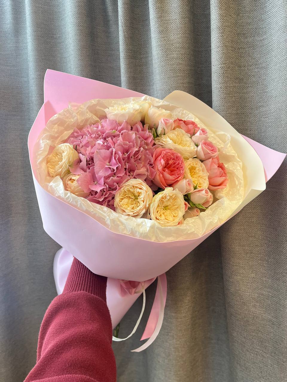 Букет из розовой гортензии и нежных пионовидных кустовых роз Darlington