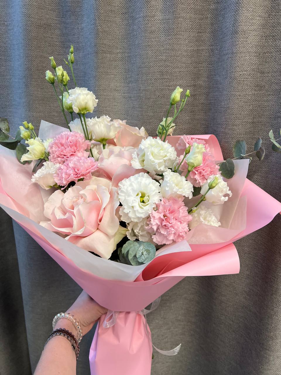 Букет "Нежность французских роз Пинк мондиаль и королевской эустомы"