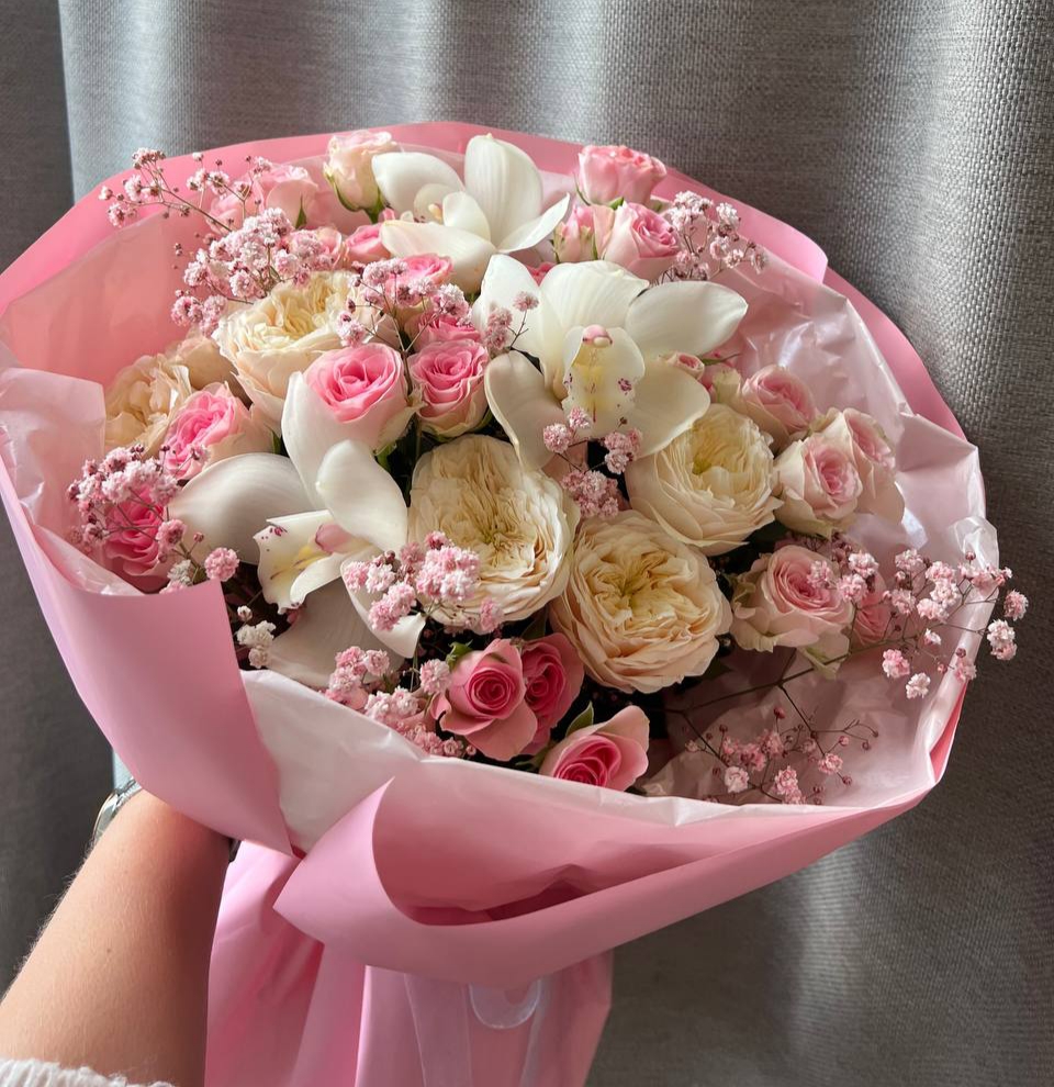 Нежный букет "Цимбидиум и пионовидные кустовые розы Darlington"